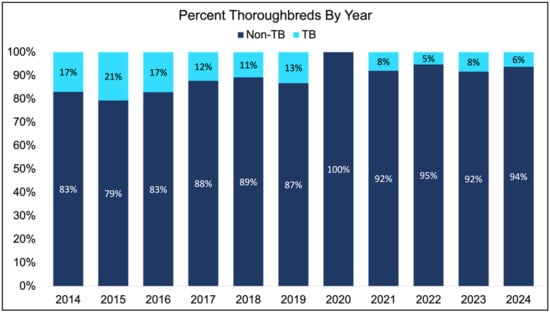 Percentage of Thoroughbreds competing at the FEI CCI5*-L level from 2014 to 2024. A decrease in the number of Thoroughbreds entered at the CCI5*-L level was noted between the years of 2018 and 2024 in comparison to 2014 to 2017.