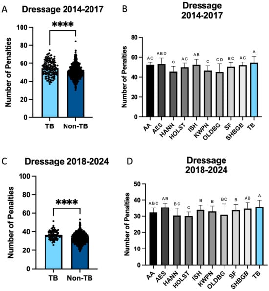 Dressage penalties accumulated in Thoroughbred and non-Thoroughbred breeds at the FEI 5* level. (A) Thoroughbreds acquired more penalties than non-Thoroughbreds breeds between the years 2014 and 2017. (B) Between 2014 and 2017, this was primarily noted as HANNs and KWPNs accruing the least dressage penalties, while TBs accrued the most. (C) Thoroughbreds acquired more penalties than non-Thoroughbreds breeds between the years 2018 and 2024. (D) From 2018 to 2024, HOLST accrued the fewer dressage penalties, while TBs continued to accrue the most penalties within this phase. **** p < 0.0001. A,B,C,D indicates significance.