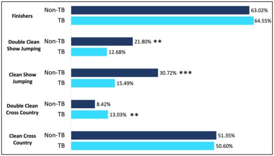 Likelihood to complete at the FEI 5* level. When comparing Thoroughbreds to non-Thoroughbreds, no difference was noted in the likelihood to complete at the CCI5*-L level. With regard to finishing, 64.5% of the Thoroughbreds finished, while 63.02% of the non-Thoroughbred entries finished. Roughly 50% of starters completed cross country without jump penalties. Of these, Thoroughbreds were significantly more likely to be without both jump and time penalty in cross country (13.0%) compared to non-Thoroughbreds (8.4%). With regard to show jumping, 30.7% of non-Thoroughbreds completed this phase without jump penalty, and this was significantly higher than Thoroughbreds. When assessing both jump and time penalties in show jumping, this was reduced to 21.8% of non-Thoroughbreds, which was significantly higher than only 12.7% of Thoroughbreds. ** p < 0.01, *** p < 0.001.