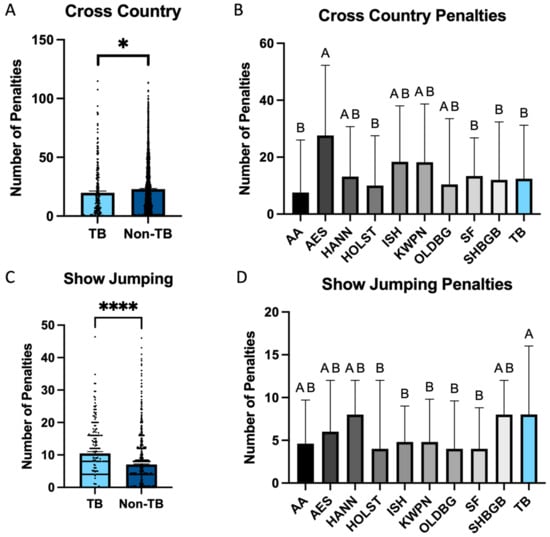 Overall jump penalties accumulated at the FEI 5* level from 2014 to 2024. (A) An overall influence of breed was noted when assessing overall cross country penalties, with Thoroughbreds accumulating fewer penalties than non-Thoroughbreds. (B) When assessing primary breeds, a significant reduction in overall cross country penalties was noted for AAs, HOLSTs, SFs, SHBGBs, and TBs in comparison to AES. (C) When assessing overall show jumping penalties, Thoroughbreds were significantly more likely to acquire penalties than non-Thoroughbreds. (D) When assessing primary breeds, this was noted as HOLSTs, ISHs, KWPNs, OLDBGs, and SFs accruing significantly fewer show jump penalties than TBs. * p < 0.05, **** p < 0.0001. A,B indicates significance.