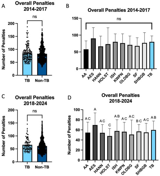 Overall penalties accumulated at the FEI 5* level from 2014 to 2024. (A) When assessing 2014–2017, no significant effect of breed was noted when comparing overall penalties accrued by either Thoroughbreds or non-Thoroughbreds. (B) This was also noted when assessing primary breeds. (C) When assessing 2018–2024, no significant effect of breed was noted when comparing overall penalties accrued by Thoroughbreds or non-Thoroughbreds. (D) A significant effect of breed was noted when comparing primary breeds, where HOLST accrued significantly fewer overall penalties in comparison to AES, ISH, and TB. Additionally, AES accrued more penalties than SF. A,B,C indicates significance, ns = not significant.