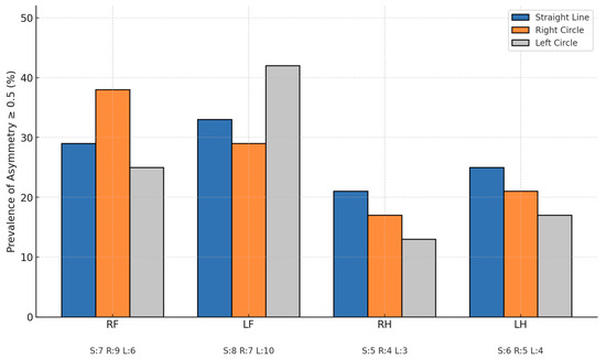 Prevalence (%) of clinically relevant asymmetries (≥0.5) per limb across different movement conditions (n = 24). The graph illustrates the percentage of horses exceeding the asymmetry threshold in the right forelimb (RF), left forelimb (LF), right hindlimb (RH), and left hindlimb (LH), when trotting on a straight line (S), on the right circle (R), and on the left circle (L). Each bar corresponds to a specific movement condition, with colours indicating straight-line (blue), right circle (orange), and left circle (green). Absolute numbers of affected horses are indicated below each column label for each condition.