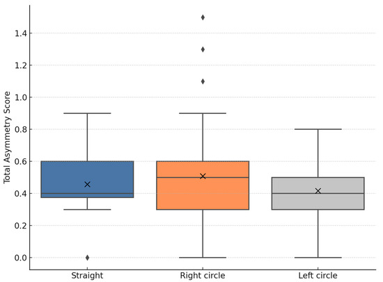 Total asymmetry scores across the three evaluated movement conditions. Boxplots represent the distribution of asymmetry values among 24 horses. The box represents the interquartile range (IQR), the horizontal line indicates the median, whiskers extend to 1.5× IQR, and black dots indicate outliers. ‘X’ symbols represent the mean.