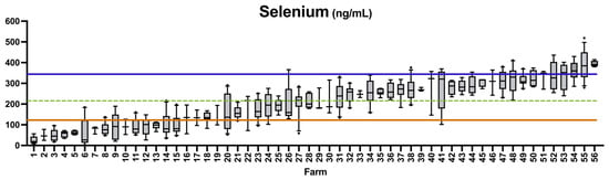 The mean Se value for all sheep in this study was 205 ng/mL. Farms were ranked by flock mean Se (Figure 1). Between three and thirteen animals were included per farm. In our study, 27.6% (n = 102) of sampled sheep were classified as Se-deficient (<120 ng/mL), while 10.5% (n = 39) of sheep sampled had Se levels exceeding the normal range (>350 ng/mL) (Table 3). When analyzed at the farm level, 26.8% (n = 15) of farms had an overall flock mean Se concentration below the deficiency threshold, while 5.4% (n = 3) had a flock mean Se concentration above the normal range (Table 3).