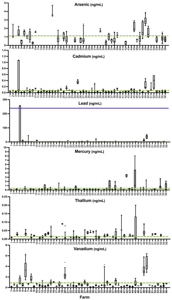 Farm status of minerals with no known nutritional benefits that are associated with toxicity, including As, Cd, Hg, Pb, Tl, and V, are graphically depicted in Figure 3. Mean values for each element in our sample are reported in Table 2. The lesser-studied minerals Al, B, Ba, Be, and Cr are included in Supplementary Figure S2. Human whole blood threshold limit values for As, B, Ba, Be, Cd, Co, Cr, Hg, Pb, and Tl have been clinically established. For As, B, Be, Cd, Cr, Hg, Pb, and Tl, the majority (59.2–100%) of sheep fell below the maximum threshold limit as set for humans even when it was much lower than the maximum threshold limit set for sheep (e.g., As, Pb) (Table 3 and Table 4). No sheep samples fell within the reported human whole blood threshold limit values for Ba (Table 4). Co concentration in sheep whole blood fell starkly below the literature value provided for sheep by Georgievskii et al. [] but it is aligned more closely with the reference limit for human whole blood.