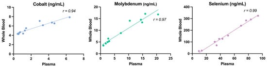 The strong correlations observed between whole blood and plasma values for Co, Mo, and Se suggest that whole blood could serve as a reliable alternative when plasma separation via centrifugation is not feasible. The derived linear equations (Table 5) allow for the conversion of whole blood concentrations to plasma-equivalent values, enabling more flexible sample collection in field settings or resource-scarce environments. This is particularly valuable for on-farm monitoring or large-scale epidemiological studies where immediate processing of whole blood is impractical and when whole blood reference values are unestablished. However, further validation across different physiological conditions, breeds, and species may be necessary to refine these equations and ensure accuracy.