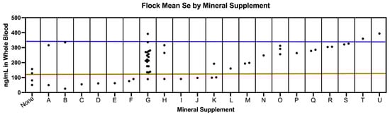 Mineral supplement brands are denoted by a letter (A-U) or none. Each dot represents a farm (n = 56). Farms are plotted by flock mean Se (ng/mL in whole blood) and mineral supplement strategy. The area between the solid lines indicates the normal reference range (120–350 ng/mL).
