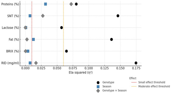 The results of the partial eta-squared (η2) analysis (Figure 2) show the greatest influence of the genotype on the fat content (η2 = 0.136) and the IgG concentration determined using the RID method (η2 = 0.164). The results are consistent with those in Table 1. Similarly, an interaction effect was observed for protein content (η2 = 0.072), which manifested itself in a seasonally specific genotype (SSP) response. These results confirm that the effect of genotype on protein content is not linear across seasons but is modulated by environmental conditions. For lactose, although a statistically significant genotype effect was confirmed (p < 0.0001) (Table 1), the proportion of variance explained by seasonal and interaction effects was small (η2 < 0.01). The variability in SNT values confirms the genotype–season interaction and emphasizes the need for an integrated interpretation of the effects. The season had a moderate effect, particularly on protein content, which is consistent with the observed seasonal variation. The results obtained on lactose content, both in terms of the genotype and seasonal effects, are consistent with the results by Picone et al. [11]. In their study, the authors found significant breed-related differences in lactose content (p > 0.0001), although they did not observe a significant effect of the season on the lactose content (p = 0.136). Hasan et al. [31] also reported that both the genotype and season significantly influence the fat, protein and lactose content in the colostrum.