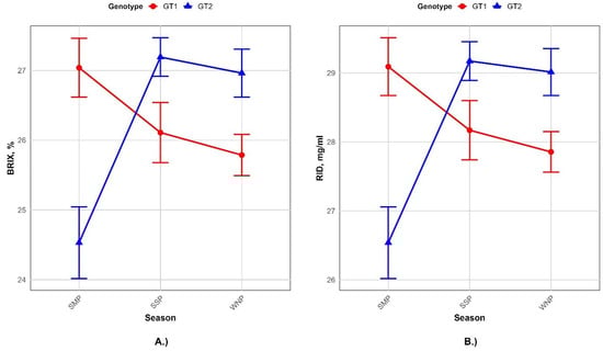 The significant interaction between the genotype and season was observed for both the concentration of IgG BRIX (p < 0.0001) as well as for the IgG concentration measured by the RID method (p < 0.0001) (Figure 3). Although the interaction effect for the BRIX value is significant, the values for GT1 differ between seasons, similar to the IgG BRIX values in the GT2 genotype. This distinct peak of IgG concentration in the SSP and WNP observed in both genotypes reflects the ability of GT2 to accumulate soluble solids during mid-season conditions. A similar trend was observed for the IgG concentrations measured using the RID refractometer. The GT2 genotype exhibited increased values during the SSP and WNP, while the decreasing trend for all the seasons was observed for GT1. The obtained results showed that IgG values measured using both the RID value and BRIX are significantly influenced by the season. However, information on the influence of the interaction between the pig genotype and the season on colostrum composition and IgG concentration is relatively scarce and remains largely undetermined.