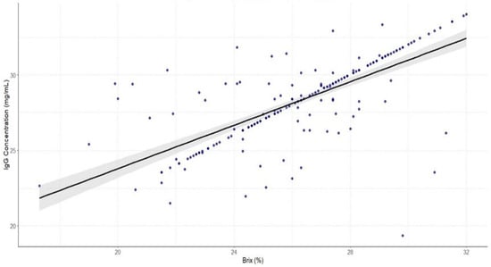 Regression plot between the concentration of immunoglobulin G (IgG) by radial immunodiffusion (RID) (mg/mL) and the refractometer Brix value (%) of the analyzed samples. The gray area represents the confidence interval of the mean value.