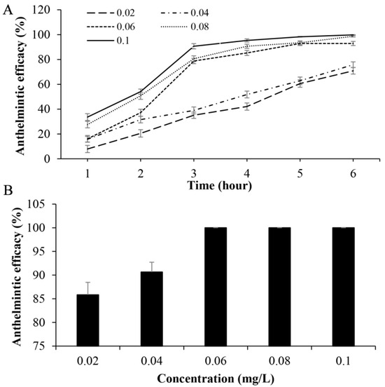 To determine whether increased fenbendazole concentrations could reduce the required exposure time while maintaining comparable anthelmintic efficacy, a separate experiment was also conducted. In this trial, infected goldfish were exposed to higher fenbendazole concentrations ranging from 0.02 to 0.1 mg/L. Parasite loads were monitored hourly for a total duration of 6 h. These fish were then moved to dechlorinated water without the drug, and parasite loads were counted following an additional 18 h recovery interval. The experimental operations and the calculation of anthelmintic efficacy were conducted using the same methodology as outlined in the initial assay.