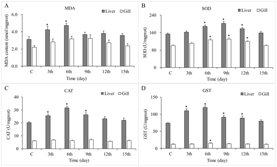 The biochemical markers of oxidative stress, (A) malondialdehyde, (B) superoxide dismutase, (C) catalase, and (D) glutathione S-transferase, in liver and gill tissues of goldfish (Carassius auratus) after an oral dose of 20 mg/kg of fenbendazole for 3 consecutive days over a 15-day course. Data are presented as means ± SE, with n = 5. Asterisk (*) indicates a significant difference between the treatment group and the control group (p < 0.05).