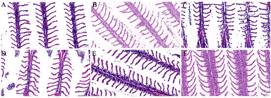 The histopathological characteristics of the gills after oral administration with fenbendazole are presented in Figure 4. The gills of the control goldfish displayed a normal structure (Figure 4A). In contrast, the treated goldfish maintained the overall structural integrity of their gills, with only limited hyperplasia observed at 3 and 6 days post-treatment.