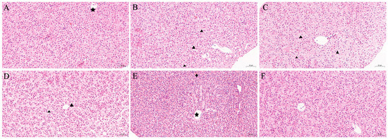 Histopathological analysis of the liver of goldfish (Carassius auratus) following oral administration of fenbendazole at 20 mg/kg body weight for three consecutive days over a 15-day course. (A) Control group gills from goldfish fed drug-free feed. (B–F) Gills from goldfish treated with 20 mg/kg fenbendazole for 3 days, sampled at (B) 3 days post-treatment, (C) 6 days post-treatment, (D) 9 days post-treatment, (E) 12 days post-treatment, and (F) 15 days post-treatment. The star indicates the central vein, the triangle indicates cytoplasmic vacuolization, and the diamond indicates pigment deposition.