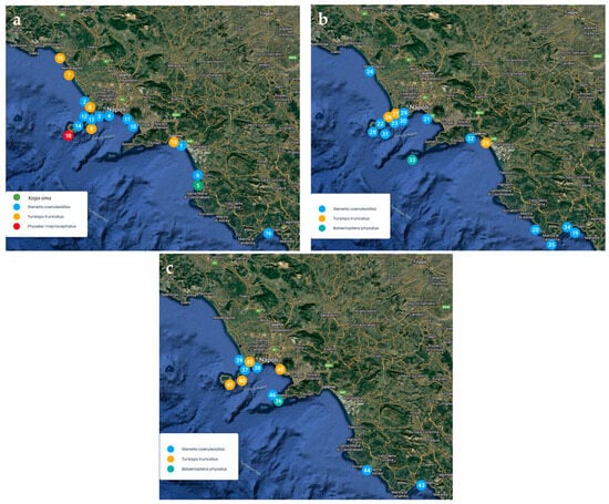 Map of the Campania coast, indicating the stranding locations of the 46 cetacean specimens studied. (a) Stranding sites of the triennium 2016–2017–2018. (b) Stranding sites of the two-year period 2019–2020. (c) Stranding sites of the two-year period 2021–2022.