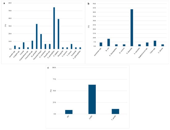 Biomolecular investigations for the detection of CeMV, HV, and T. gondii were systematically carried out, and the results highlighted, respectively, 30/46 (65.2%), 4/46 (8.7%), and 5/46 (10.7%) positive specimens, as indicated in Figure 2c.