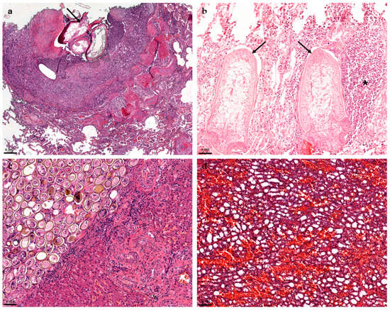 In the respiratory system, bronchopneumonia in striped dolphins (ID 19, 21, 22, 23, 32, 34) and pneumonia in common bottlenose and striped dolphins (ID 8, 10, 31, 35, 37, 38) of parasitic (Figure 3a), bacterial, and viral aetiology were reported. In addition, pulmonary atelectasis and pleuritis were detected in cases ID 18 and 32, respectively, probably due to infectious origin.