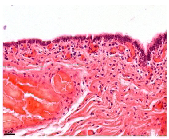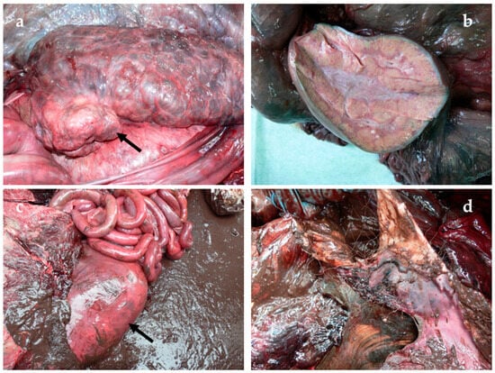 Considering the reproductive system, cases ID 35 and 38 showed parasitic mastitis (Figure 3d) and endometritis (Figure 4), respectively. Instead, case ID 43 showed lymphocytic endometritis and ovaritis possibly associated with infectious origin.