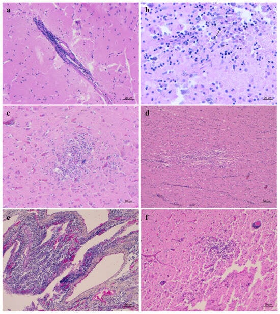 (a) Frontal cortex (ID 24). Mild non-suppurative (NS) meningitis. H&E (10x). (b) Cortex (ID 34). Severe malacic area with several gitter cells and few syncytia cells (arrow). H&E (20x). (c) Cortex (ID 21). Focus of gliosis and neuronophagia. H&E (10x). (d) Cortex (ID 37). Area of moderate spongliosis in white matter. H&E (10x). (e) Plexus choroideus (ID 37). Severe and widespread NS plexus choroiditis. H&E (10x). (f) Thalamus (ID 37). Severe granulomatous encephalitis with perivascular cuffings and numerous protozoan cysts. H&E (10x).