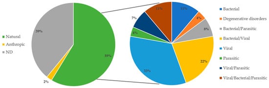 On the (left) are the classifications of COD categories (natural, anthropic, and ND) in percentages. On the (right) are the COD sub-categories (bacterial, degenerative disorders, bacterial/parasitic, bacterial/viral, viral, parasitic, viral/parasitic, viral/bacterial/parasitic) in percentages.