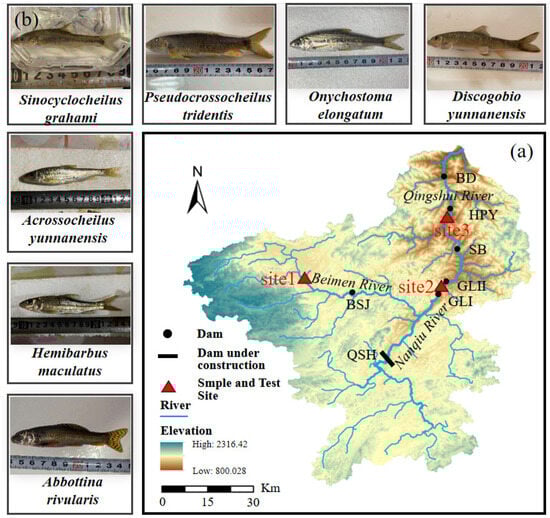 The Qingshui River is an important tributary of the upper Pearl River in Southwest China (Wenshan City, Yunnan Province), with a total length of 134 km. A large variation in the water level leads to complex habitats, cultivating plenty of endemic fish species. Among the endemic fish in the Qingshui River basin, Acrossocheilus yunnanensis (Regan, 1904), Abbottina rivularis (Basilewsky, 1855) and Onychostoma elongatum (Pellegrin & Chevey, 1934) have a short-distance migration requirement during their spawning period. The Qingshui River basin is endowed with abundant water energy storage and large water-level differences. Several hydropower projects have been developed in the Qingshui River basin, adversely affecting the short-distance migration of fish and blocking the exchange of fish genes upstream and downstream of dams.
