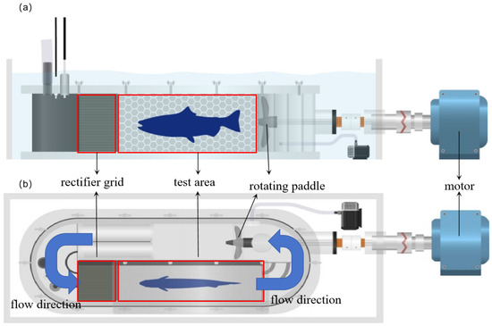 The swimming ability test system. (a) and (b), respectively, represent the front view and the top view of the device.