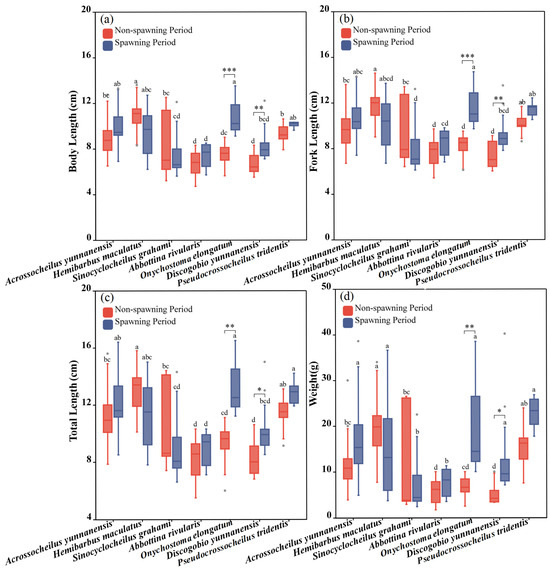 Morphological characteristics of experimental fish during the non-spawning and spawning period. (a–d) represent differences of standard body length (SL), fork length (FL), total length (TL) and weight (W) between two periods and seven studied fish, respectively. The boxes in the figure illustrate the range of lower and upper quartiles. The whiskers indicate the 1.5 interquartile range. The median values are represented by solid lines, respectively. The gray dots outside the boxes represent data that are outliers. The asterisks indicate significant differences in morphological parameters between the two periods (* indicates p < 0.05, ** indicates p < 0.01, *** indicates p < 0.001). Letters above boxes represents the results of post-hoc multiple comparisons.