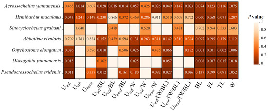 Heat map describing the differences in the swimming ability (Uind, Uind/SL, Uind/W, Uind/(W/SL), Ucrit, Ucrit/SL, Ucrit/W, Ucrit/(W/SL), Uburst, Uburst/SL, Uburst/W, Uburst/(W/SL)) of seven fish species in the Qingshui River basin between the two periods. The color in cells ranging from dark to light with P values represents the significance level from high to low, while empty cells without values indicate that the data were not obtained.
