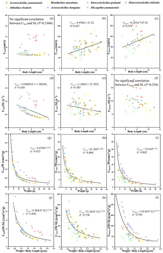 Relationship between morphological parameters and swimming ability. (a–c) represents relationship between standard body length and swimming ability (Uind, Ucrit and Uburst), respectively. (d–f) represents relationship between standard body length and swimming ability (Uind/SL, Ucrit/SL and Uburst/SL), respectively. (g–i) represents relationship between weight and swimming ability (Uind/W, Ucrit/W and Uburst/W), respectively. (j–l) represents relationship between weight/standard body length and swimming ability (Uind/(W/SL), Ucrit/(W/SL) and Uburst/(W/SL)), respectively.