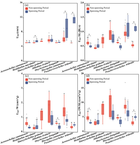 Differences between the Uind, Uind/SL, Uind/W and Uind/(W/SL) of experimental fish across species and periods. (a–d) represent differences of Uind, Uind/SL, Uind/W and Uind/(W/SL) between two periods and seven studied fish, respectively. The boxes in the figure illustrate the range of lower and upper quartiles. The whiskers indicate the 1.5 interquartile range. The median values are represented by solid lines, respectively. The gray dots outside the boxes represent data that are outliers. * represents a statistically significant difference in Uind between the non-spawning and spawning periods (* indicates p < 0.05). Letters above boxes represents the results of post-hoc multiple comparisons.