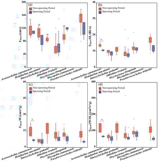 Differences between the Uburst, Uburst/SL, Uburst/W and Uburst/(W/SL) of the experimental fish across species and periods. The boxes in the figure illustrate the range of lower and upper quartiles. (a–d) represent differences of Uburst, Uburst/SL, Uburst/W and Uburst/(W/SL) between two periods and seven studied fish, respectively. The whiskers indicate the 1.5 interquartile range. The median values are represented by solid lines, respectively. The gray dots outside the boxes represent data that are outliers. * represents a statistically significant difference in Uburst between the non-spawning and spawning periods (* indicates p < 0.05). Letters above boxes represents the results of post-hoc multiple comparisons (LSD or Tamhane’s T2 test, p < 0.05). Groups sharing no common letters differ significantly (“a” represents the highest mean value of this group, and “b” represents the lowest.), and there was no statistical difference among the groups with any of the same letters (such as “ab” and “a”, “b” and “ab”, etc.).