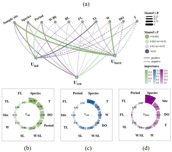 As shown in Figure 9a, the result of the Euclidean distance from the mantel test indicates that weight parameters (W and W/SL) were positively related to Ucrit (p < 0.05, R > 0) but negatively connected to Uburst (p < 0.05, R < 0). Weight parameters were more correlated with swimming ability than body length parameters (SL, FL and TL). The period was significantly correlated with Uind (p = 0.002), the sample site was significantly correlated with Uburst (p = 0.001) and the DO and water temperature exhibited a significantly positive correlation with Ucrit (for DO: p = 0.009, R = 0.195; for T: p = 0.008, R = 0.194). As shown in Figure 9b–d, the result of RF indicates that species, DO and T were the prominent factors affecting fish swimming ability in this study (% importance for species > 12.16, for DO > 7.98 and for T > 9.47). The sample site was a secondary important factor influencing Uburst and the period was also an important factor influencing Uind. Weight parameters were found to have greater effects on fish swimming speeds than the body length parameters. Generally speaking, the species identity was the main factor shaping the swimming ability, followed by environmental factors and morphological factors, combining the mantel test and RF.