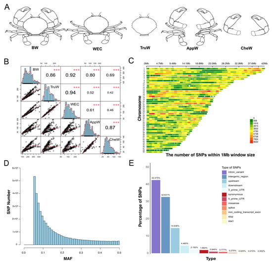 Statistics of phenotypic and sequencing data. (A) Five weight-related traits of S. paramamosain. The abbreviations BW, WEC, TruW, AppW, and CheW correspond to body weight, weight excluding chelae, trunk weight, appendage weight, and cheliped weight, respectively. (B) Correlation among the five traits. *** indicates a p-value less than 0.001. (C) Density plot of SNP distribution across chromosomes based on sequencing data, generated using the R package CMplot (v4.5.1) []. (D) Distribution plot of the minor allele frequency (MAF) counts for SNPs. (E) Classification information of SNPs after annotation.