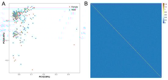 Population genetic structure analysis. (A) Principal component analysis; red and blue dots represent female and male individuals, respectively; (B) heatmap of the genetic relationship matrix for the tested population.