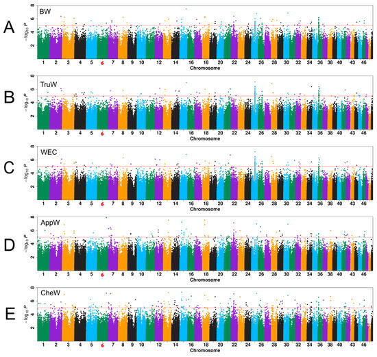 Manhattan plots from genome-wide association studies. (A) Body weight (BW); (B) trunk weight (TruW); (C) weight excluding chelae (WEC); (D) appendage weight (AppW); (E) cheliped weight (CheW). Red dashed lines indicate the significance threshold (p = 10−5). Chromosome 6 (highlighted in red) corresponds to the sex chromosome as previously reported [].