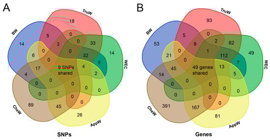 Venn diagram analysis of GWAS results. (A) Shared significant SNP loci across five traits. Numerical values within intersection areas denote the quantity of shared SNPs, with the central overlap indicating nine SNPs common to all five traits. (B) Shared candidate genes across five traits. Numerical values within intersection areas denote the quantity of shared genes, with the central overlap indicating 49 candidate genes common to all five traits. The full names corresponding to the five phenotypic abbreviations can be found in Table 1.