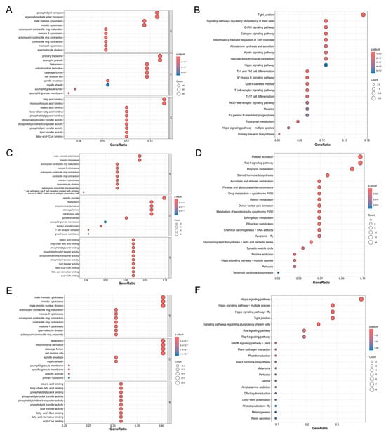 For the traits of the BTW group, a total of 757 GO terms were detected, including 616 biological process (BP) terms, 53 cellular component (CC) terms, and 88 molecular function (MF) terms (Figure 5A, Table S5). For the AC group, 429 GO terms were detected, encompassing 340 BP terms, 45 CC terms, and 40 MF terms (Figure 5C, Table S5). There were 155 GO terms shared between the two groups (Figure 5E, Table S5), which primarily involved biological processes such as actomyosin development (e.g., GO:0031566 actomyosin contractile ring maturation; GO:0000916 actomyosin contractile ring contraction), germ cell division (e.g., GO:0007112 male meiosis cytokinesis; GO:0007111 meiosis II cytokinesis), lipid transport (e.g., GO:0015914 phospholipid transport; GO:0110112 regulation of lipid transporter activity), skeletal development (e.g., GO:0048706 embryonic skeletal system development; GO:0048705 skeletal system morphogenesis), organogenesis (e.g., GO:0048703 embryonic viscerocranium morphogenesis; GO:0048645 animal organ formation), immunity (e.g., GO:0035722 interleukin-12-mediated signaling pathway; GO:0032740 positive regulation of interleukin-17 production), optesthesia (GO:0046669 regulation of compound eye retinal cell-programmed cell death; GO:0061074 regulation of neural retina development), and olfaction (GO:0021553 olfactory nerve development). In terms of cellular components, the enriched terms mainly related to cellular energy metabolism and differentiation (e.g., GO:0016006 Nebenkern; GO:0005766 primary lysosome), immune response (e.g., GO:0042582 azurophil granule; GO:0035577 azurophil granule membrane; and GO:0042581 specific granule), etc. For molecular functions, they primarily concerned lipid and fatty acid binding (e.g., GO:0070540 stearic acid binding; GO:0005504 fatty acid binding) and phospholipid transport (e.g., GO:0005548 phospholipid transporter activity; GO:0120013 lipid transfer activity), etc.