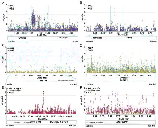 In this section, we focused on the common regions among three traits in the BTW group, the candidate regions shared by the two traits in the AC group, and the candidate regions that are ubiquitous across all five traits (Figure 6). Within the common regions of the BTW group, 11 candidate SNPs were concentrated in the chr25: 11,640,576–11,928,077 region, which harbors the appetite-related gene CCHa1R (neuropeptide CCHamide-1 receptor) (Figure 6A). Additionally, one candidate SNP was mapped to the 5,581,593–5,781,593 region of chromosome 36, which encompasses the gene YIPF1 (Yip1 domain-containing) (Figure 6B).