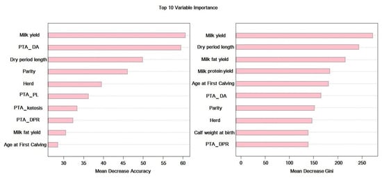 Feature selection was performed to discard uninformative features from the dataset []. Feature selection is extremely important in ML algorithms because it reduces computational costs, avoids overfitting [], leads to the reduction in the distractive effect of noisy features [], and by choosing the optimal subset of predictors, it promotes the efficiency of the model []. In the current study, Random Forest was performed to select the most effective set of features only on the training set. For this purpose, the mean reduction in the Gini index and the mean decrease in accuracy were used. Random Forest was performed with the number of trees to grow (500:1000) and the number of candidate variables randomly sampled in each split (4:5) in each iteration. The top 15 features for the mean decrease accuracy and the mean decrease in Gini index were selected and saved. Finally, the training process was conducted with the union of two feature sets selected. According to the results of trait importance and based on the intersection of both criteria considered in this study, milk yield, PTA_DA, dry period length, parity, milk fat yield, herd, AFC and PTA_DPR are the most important features in predicting DA (Figure 1). The selected features in the feature selection stage were highlighted in Table 2.