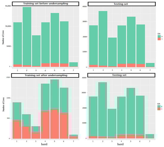 DA is a complex trait and many predisposing factors are involved in its occurrence. This disease usually occurs early in the postpartum period. In the current study, 63% of cases of DA occurred in the first month after calving. The incidence rate of DA is low and leads to a severe imbalance in the data. Hence, it is difficult to achieve accurate prediction. In the present study, down-sampling techniques were applied for the training dataset used to train DA case prediction models.