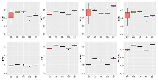 Boxplots of model performance metrics showing prediction variability in different algorithms on the testing set in 10 iterations; DT = Decision Tree, GB = Gradient Boosting (Machines), LR = Logistic Regression, NB = Naïve Bayes, RF = Random Forest, ACC = overall accuracy, BACC = balanced ACC, TPR = true positive rate, TNR = true negative rate, AUROC = Area Under the ROC, PPV = precision, F2 = F2-measure and AUPRC = Area Under the Precision–Recall Curve.
