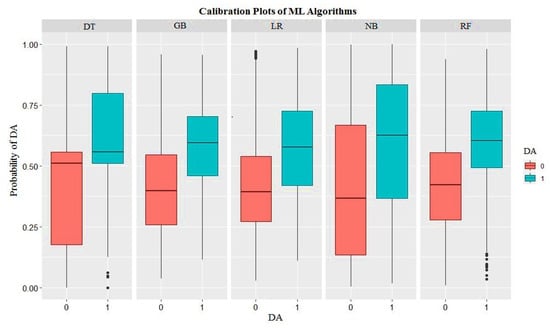 The performance of the different machine learning algorithms used to predict cases of DA using a highly imbalanced dataset (hold-out testing dataset) is shown in Table 4 and Figure 4. Also, the calibration, which indicates the degree to which the predicted risk matches the actual risk, was shown using calibration plots (Figure 5). The classification accuracy of predictive models ranged from 62% to 69%. In terms of ACC, LR and GBM outperformed other machine learning algorithms at 0.68 and 0.69, respectively. The greatest value of F2-measure was achieved with GBM and RF, whereas NB had the lowest (0.33 vs. 0.27). In terms of the TPR, RF outperformed other machine learning algorithms at 0.75, whereas LR was the lowest. Considering the PPV, it was GBM that outperformed other methods at 0.10. PPVs were low for all algorithms and varied between 0.07 (NB) and 0.10 (GBM) across algorithms. The greatest value of AUPRC and AUROC was achieved with GBM (0.17) and RF (0.76), respectively.