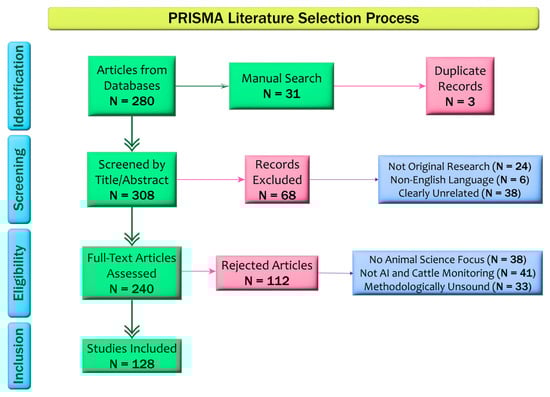 The screening followed a three-stage process. First, a total of 311 records were obtained: 280 from databases, and 31 from manual and Litmaps-aided citation discovery. After removing three duplicates, 308 records remained for title and abstract screening. In this phase, 68 papers were excluded due to a lack of relevance, originality, or not being in English. Two hundred forty papers proceeded to full-text review. During this stage, 112 additional papers were excluded: 41 were on topics unrelated to AI and cattle monitoring, 38 did not focus on animal science, and 33 were deemed methodologically unsound and unfit.
