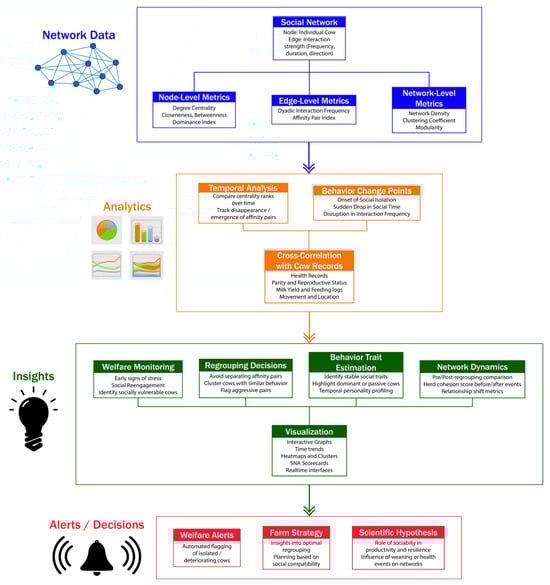 These visual information streams are mapped by SNA into interpretable social metrics. Indicators like degree centrality, betweenness, or association strength, as listed in Table 1, quantify the level of connectivity and interaction each cow has with the other members of the group, and how central it is to the cohesion of the herd. These are not ungrounded academic abstractions—they constitute practical measures of stress, social isolation, or declining health [18]. Figure 2 provides a visual representation of how social network metrics are processed into actionable insights, management decisions, and welfare alerts.