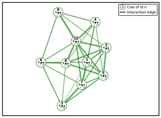 In the past, behavioral data collection in cattle studies involved a lot of fieldwork, requiring lots of time and personnel trained to observe the subjects. Scan sampling methods were employed by several studies, where a group of trained human observers note licking and agonistic behaviors in a cow herd with a fixed time interval (e.g., every six minutes), noting their spatial proximity (e.g., within 4 m) [1,7]. This approach is usually conducted over extended periods, such as six weeks. Figure 3 provides a visual example of a social network graph derived from observed interactions among cows within a herd.