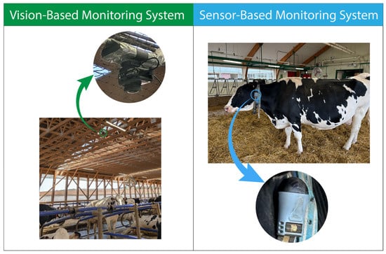Visual comparison of typical equipment setups in dairy barns contrasting vision-based monitoring systems (using cameras) and sensor-based systems (using wearable sensors), highlighting the differences in complexity, invasiveness, and setup requirements.