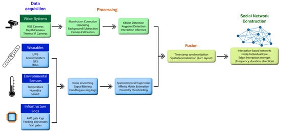 The integration of vision, audio, and even wearable sensors into a single framework enhances behavioral inference—these systems are known as multimodality fusion systems [50]. More sensors that enable the recording of cattle behavior must be integrated into wearable devices. Figure 5 visually illustrates the process of integrating multimodal data streams into a unified monitoring framework for constructing a social network.