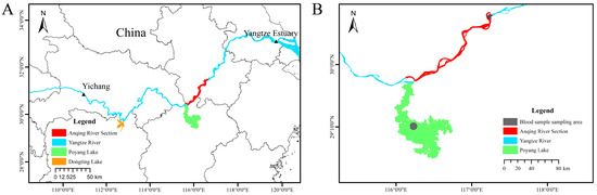Distribution ranges of the YFP and sampling locations for the Poyang and Anqing populations. (A): The distribution range of the YFP in the middle and lower reaches of the Yangtze River extends from the Yichang section of the upper Yangtze River to the Yangtze River estuary (the area between the two black triangles), including Poyang Lake (green area) and Dongting Lake (orange area). (B): The sampling locations for the Poyang and Anqing populations in this study are indicated as follows: the green region represents the waters of Poyang Lake; the red region corresponds to the Anqing section of the Yangtze River. The gray circular area indicates the blood sample collection sites for the Poyang analysis, and the gray star-shaped area denotes the blood sample collection sites for the Anqing analysis. The red region signifies the collection sites for deceased tissue samples of the Anqing analysis.