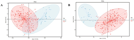 Results of Principal Component Analysis (PCA) for the Poyang and Anqing populations based on 20 microsatellite loci. (A): PCA results for the two populations before excluding dead tissue samples from the Anqing population. (B): PCA results for the two populations after excluding dead tissue samples from the Anqing population. The red area represents the Poyang population (PY), and the blue area represents the Anqing population (AQ).