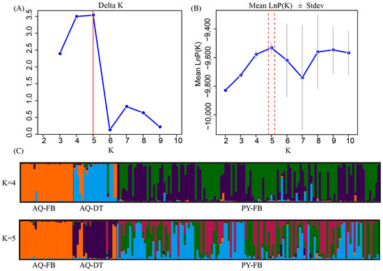 The results of the PCA indicated that, in comparison to the clustering observed prior to the exclusion of the dead samples from the Anqing population (Figure 3), the clustering among individuals of the two populations became more dispersed following the removal of the dead tissue samples. This suggested an increase in the genetic differences between the two populations. STRUCTURE analysis indicated K = 5 as the optimal number of genetic clusters, supported by the maximum value of ΔK (Figure 4A) and the peak in mean LnP(K) (Figure 4B). This partitioning revealed distinct genetic clusters corresponding to the Anqing and Poyang populations. Moreover, some sample individuals in the AQ-DT cluster show genetic admixture with the Poyang population (Figure 4C).